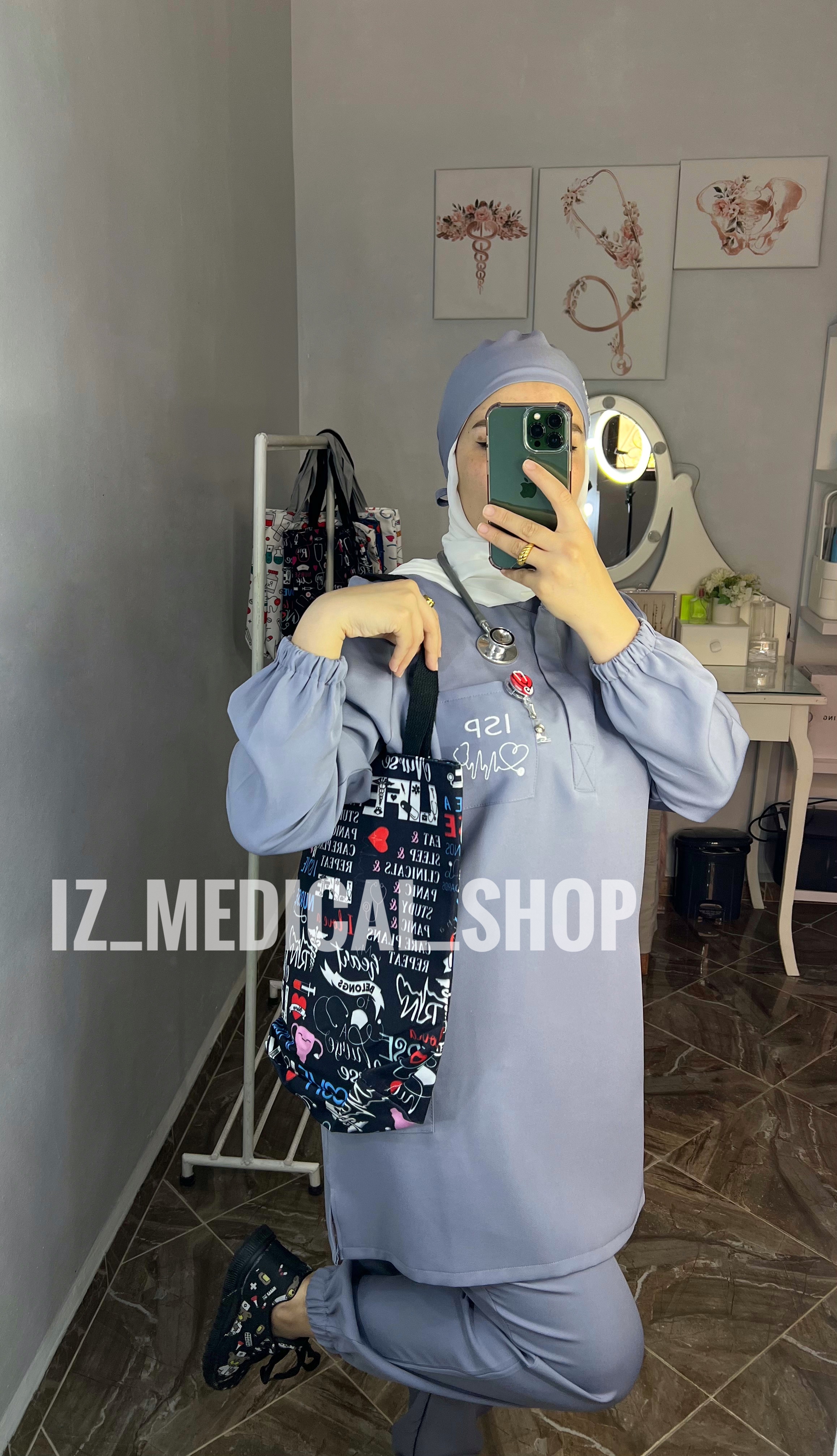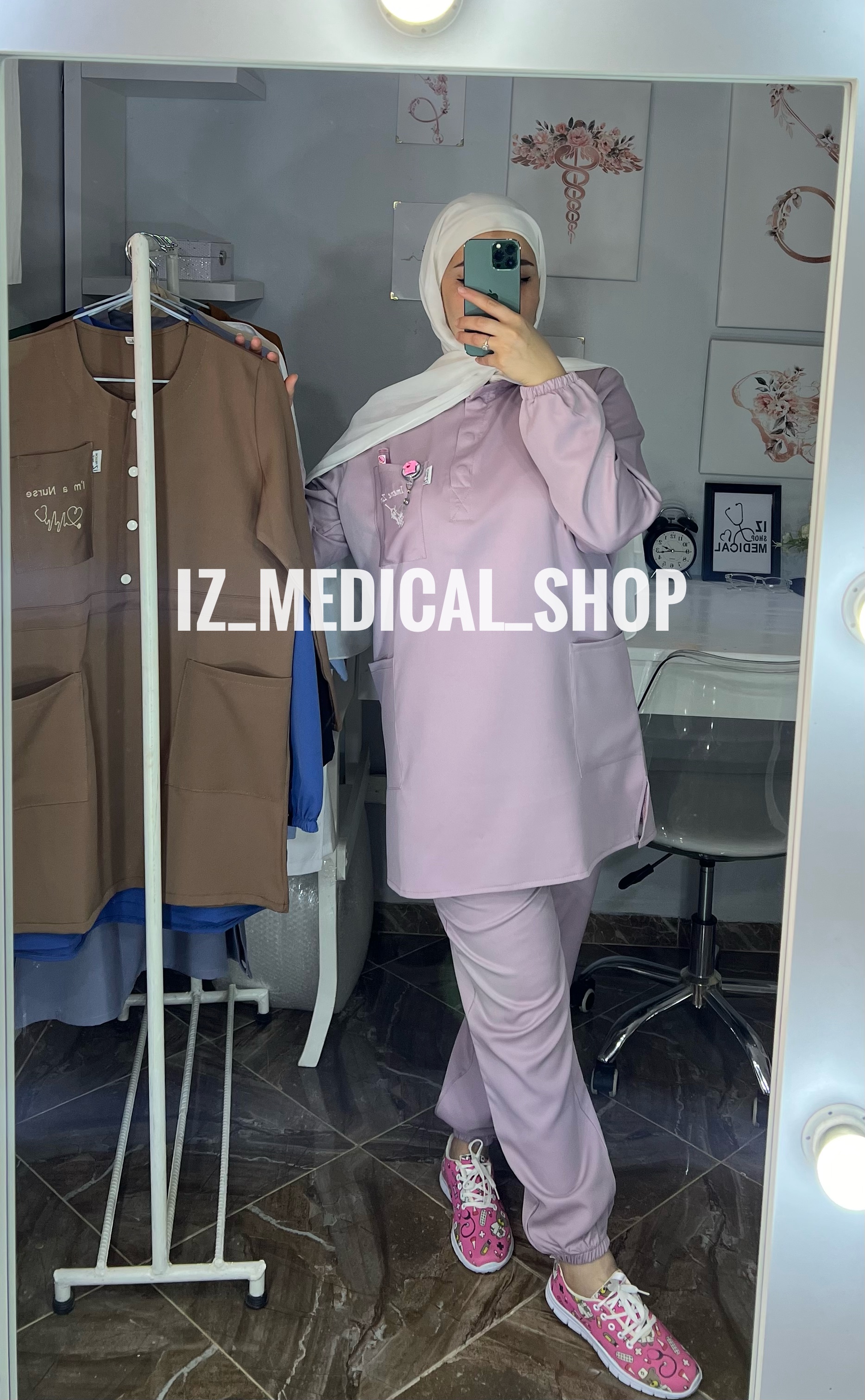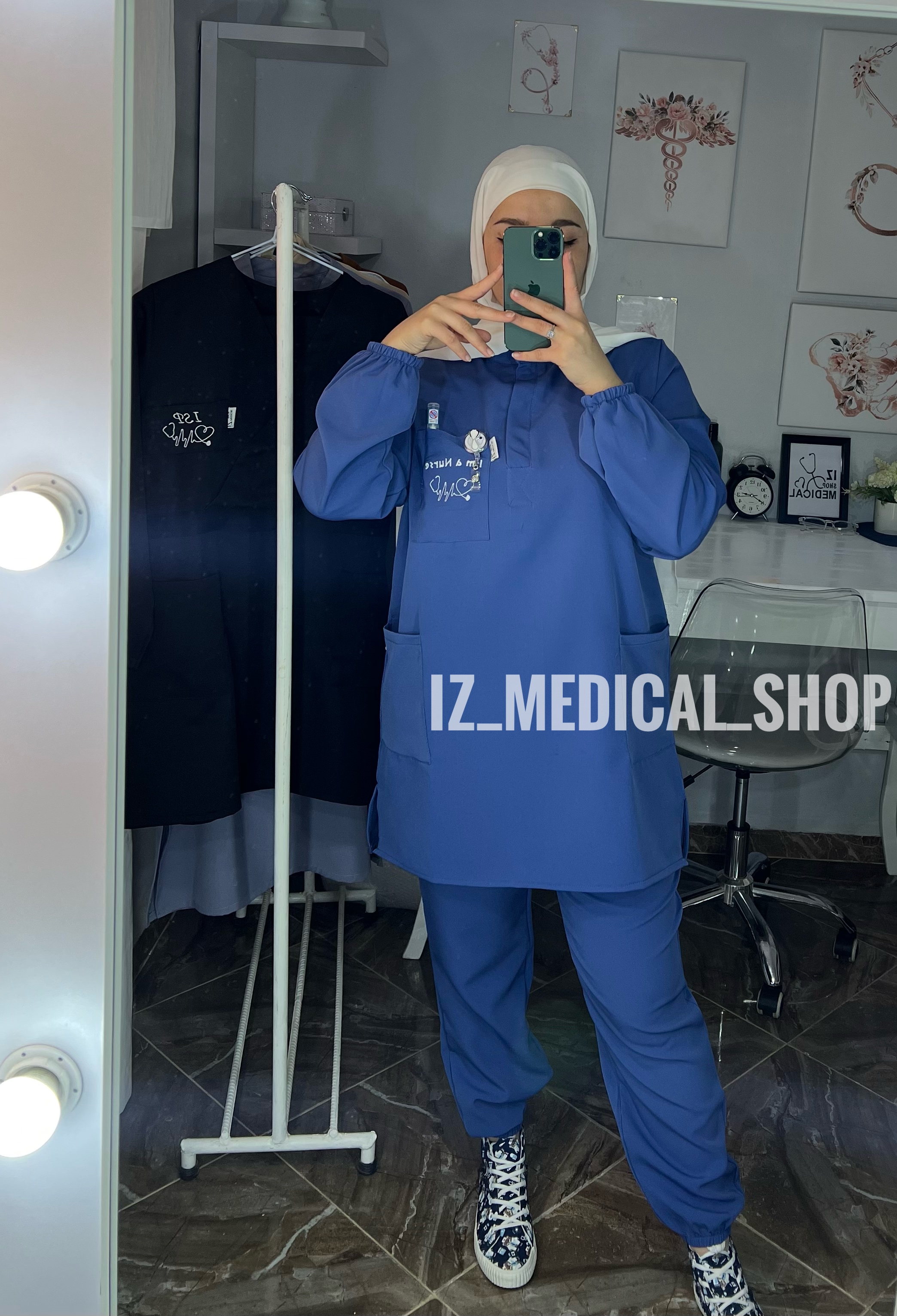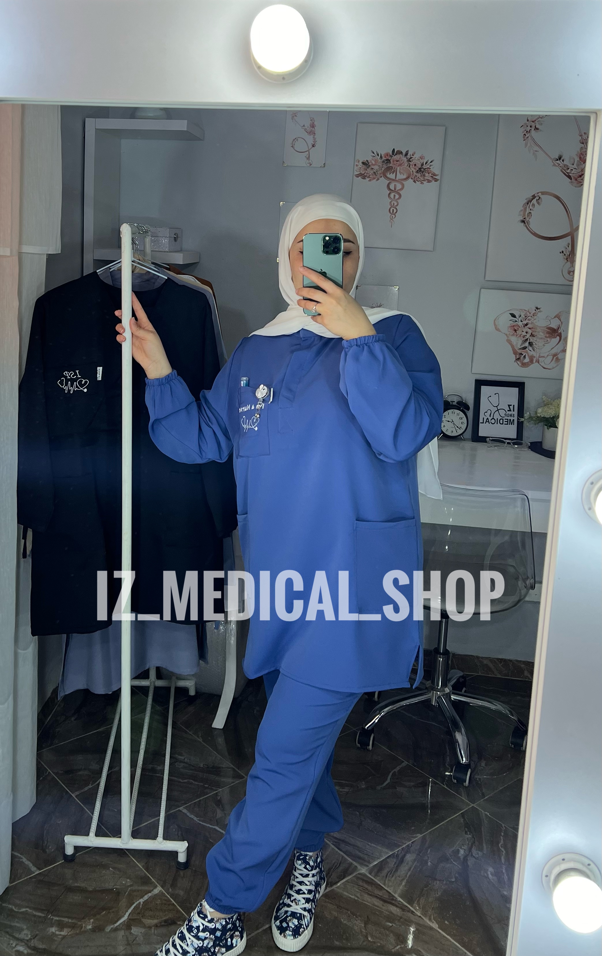 Tenue médicale de la haute gamme ,très confortable pour travailler au milieu hospitalier, avec un tissu anti bouloches , un haut forme droite avec 3 poches , col bateau , et un élastique au niveau des poignets . Le pantalon super fluide forme droite avec élastique au niveau des pieds . La personnalisation est toujours disponible à votre choix . La longueur standard du haut : 85cm Possibilité de modifier la longueur : sus genoux , sous genoux ou bien jusqu'au pieds.